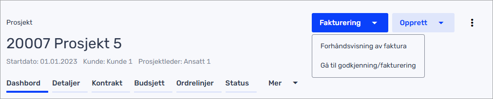 Viser hvilken prismodell prosjektet har, kontaktinformasjonen til kunden, kundenavn og antall underprosjekter som er knyttet til prosjektet.