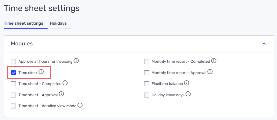 - In the «Modules» section, check the box for «Time clock».