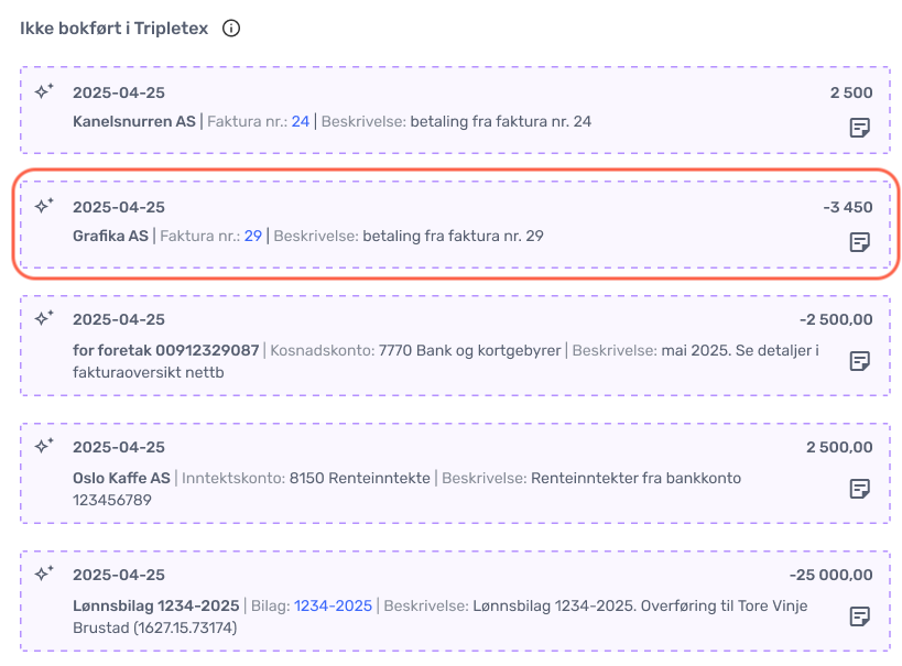 Basert på innbetalingen fra kontoutskriften, vil Tripletex gi deg et forslag til bokføring. Vil du se nærmere på fakturaen? Klikk på fakturanummeret i blått, så kommer du rett inn på den.