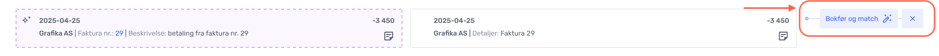 Ønsker du ikke å bokføre? Da kan du trykke på det blå krysset til høyre istedenfor. Bokføringsforslaget vil da forsvinne, og transaksjonen på høyre side vil legge seg som «Ikke matchet» i bankavstemmingen.
