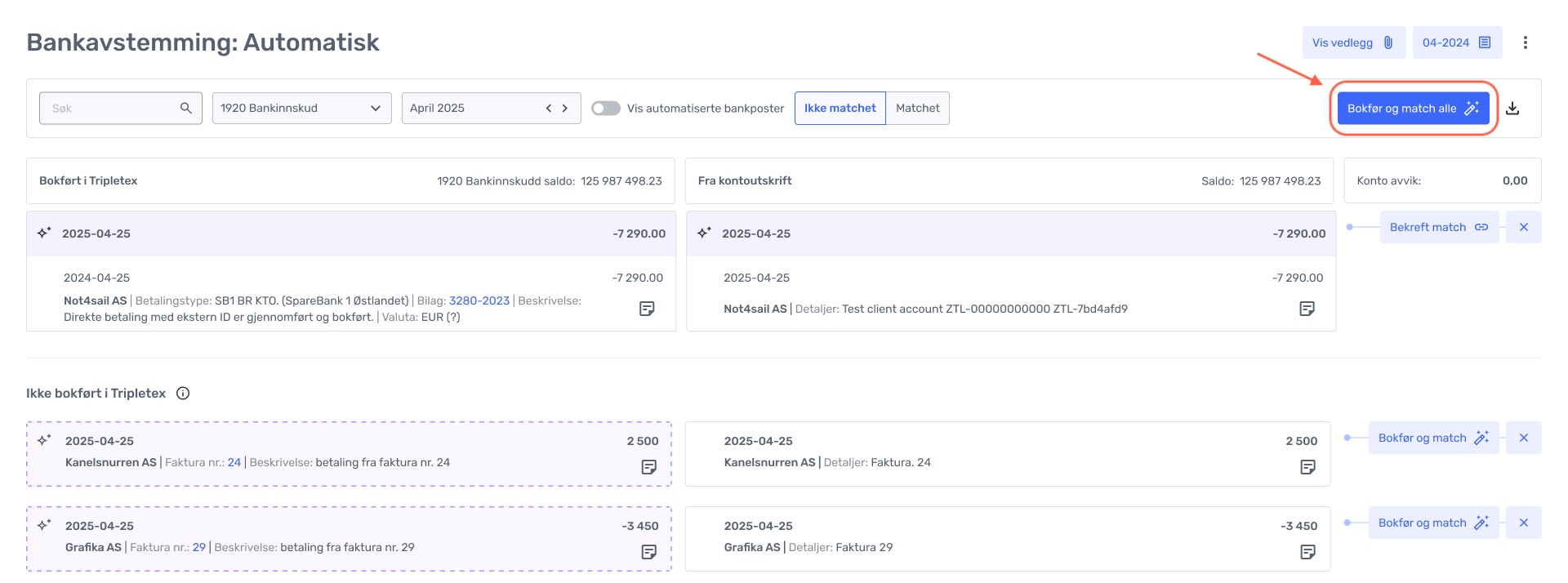 Da trykker du på «Bokfør og match alle» i den blå boksen oppe til høyre på siden.