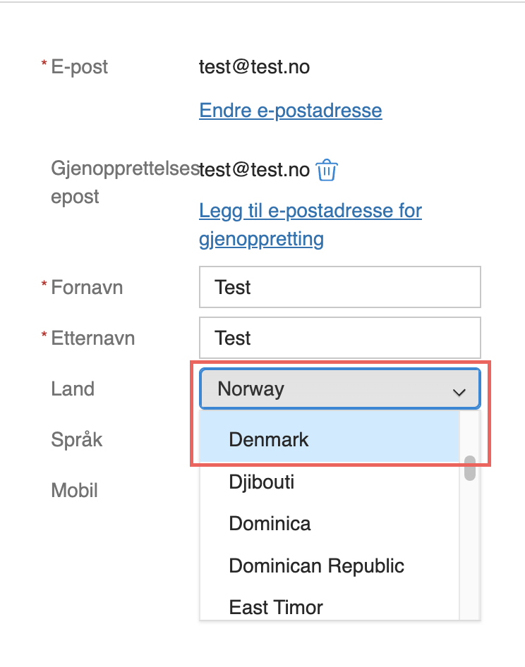 4. Velg «Denmark» fra nedtrekksmenyen for å velge land.
