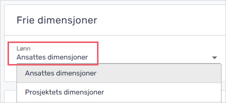 Har du prosjekter i kontoen? Gå til Regnskap > Innstillinger > Regnskapsinnstillinger og velg om frie dimensjoner skal hentes kun fra ansatte eller fra prosjektene dine på prosjektrelaterte aktiviteter. Dette styrer hvordan dimensjonene fylles ut på lønnskjøringen.