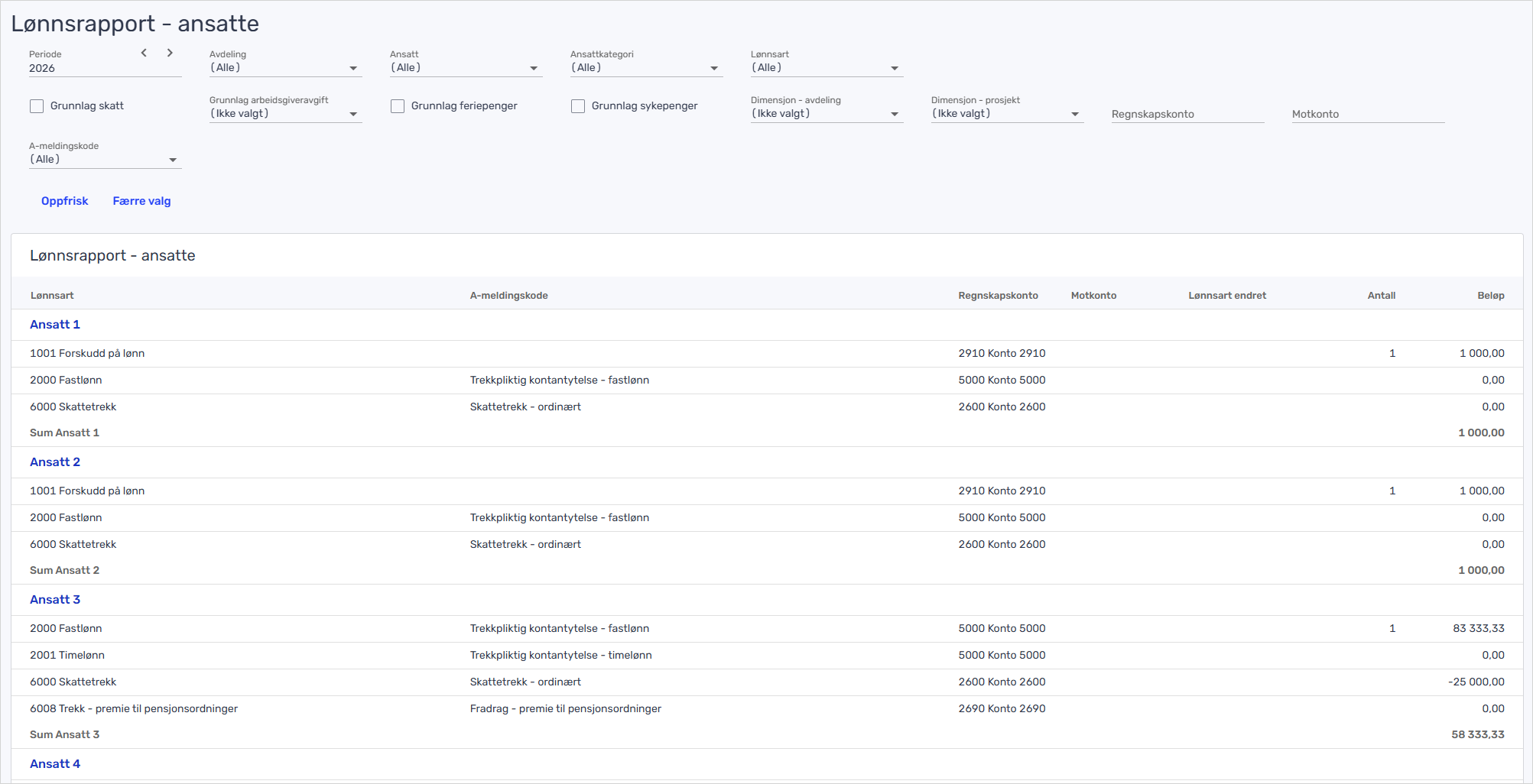 Lønnsrapporten er en rapport i Tripletex som gir deg full oversikt over lønn som er bokført i en valgt periode. Du ser lønnsarter, a-meldingskoder, regnskapskontoer, motkontoer, antall og beløp – per lønnsart og per ansatt.