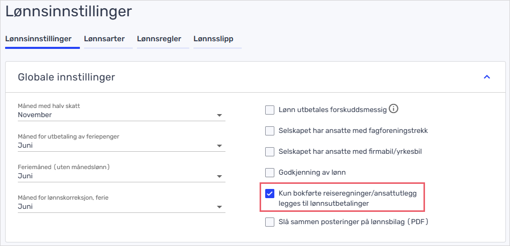 Dette skjer typisk hvis du lar kun bokførte reiseregninger og ansattutlegg legges til lønnsutbetalingen din – da er sjansen større for at reiseregningen/utlegget og utbetalingen i lønnsbilaget bokføres i hver sin måned.